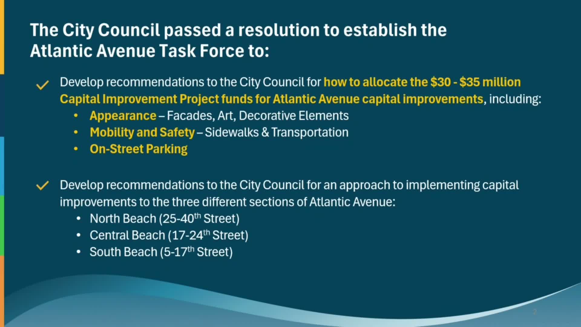 The mayor's Atlantic Avenue Task Force proposed a $30–$35 million package of streetscape improvements — milling and overlay, sidewalks, bike lanes, wayfinding, and a $1.1 million public‑art allocation — and recommended microcommerce (parklet) areas in Central Beach; council asked for one more focused task‑force meeting on microcommerce details.