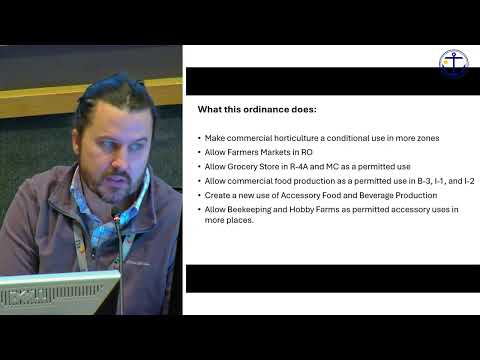 Planning Department long-range planner Daniel McKenna Foster told the commission the ordinance package would "make commercial horticulture conditional use in more zones," allow farmers markets in RO zones, permit grocery stores in R4A, make commercial food production permitted in several commercial and industrial zones, and create a new accessory "food and beverage production" use separate from home-occupation rules. He said the proposal also would "allow beekeeping and hobby farms as permitted accessory uses in more places."
