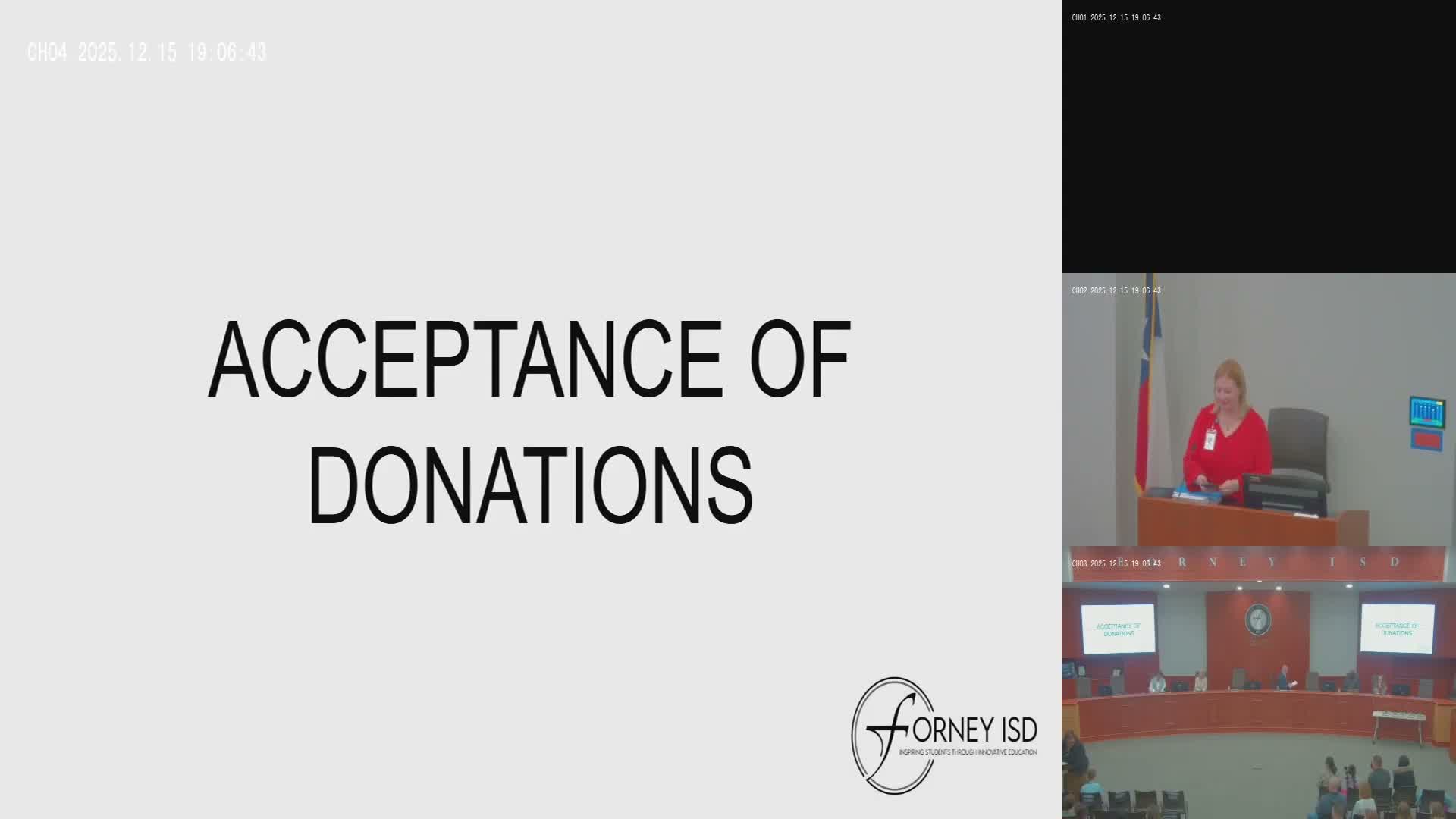 The Forney ISD board recognized students and holiday card contest winners, accepted booster and club donations totaling $26,400 for athletics programs, heard a brief master-planning update on three construction projects, and received public comments from a state Senate candidate and the FFA vice president inviting the board to upcoming events.