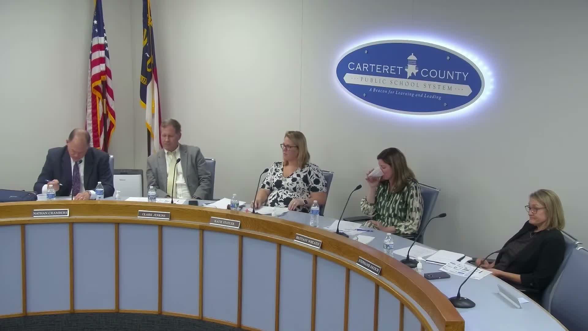 Staff reported punch-list work at West Carteret (auditorium renovation and HVAC testing) with a hoped-for completion around March, said East Carter High School’s art room is finished, and reminded the public of a Feb. 3, 2026 public-input session on the 2026–27 budget at 107 Seyfert Drive, Beaufort.