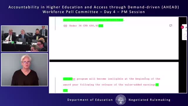 The Department committed to wording changes and to circulate revised regulatory and operational language ahead of a planned consensus vote. No formal liability determinations or rule adoptions occurred during the session; negotiators requested explicit draft language describing how liabilities will be calculated and enforced and how student Pell restoration will be handled in practice.