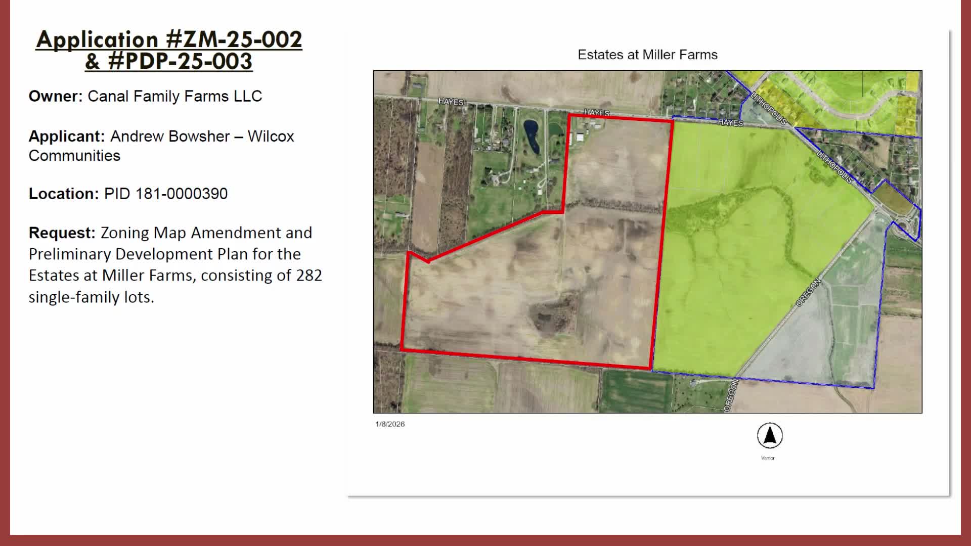 The commission voted to table zoning map amendment ZM25-0002 (EU to PRD) and preliminary development plan PDP25-0003 for a proposed 111.23-acre development at 5593 Hayes Road — the Estates at Miller Farms — after staff detailed multiple outstanding items staff and commissioners want resolved before a formal vote.