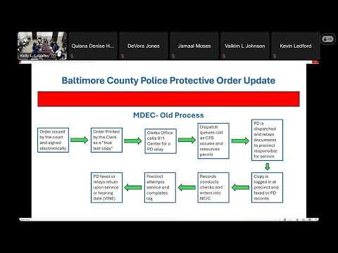 Baltimore County police told a domestic violence committee the county and Maryland courts have implemented an electronic transmission pipeline so signed protective orders route directly to a monitored police records inbox, reducing manual relay delays and allowing earlier service attempts and preliminary record checks.