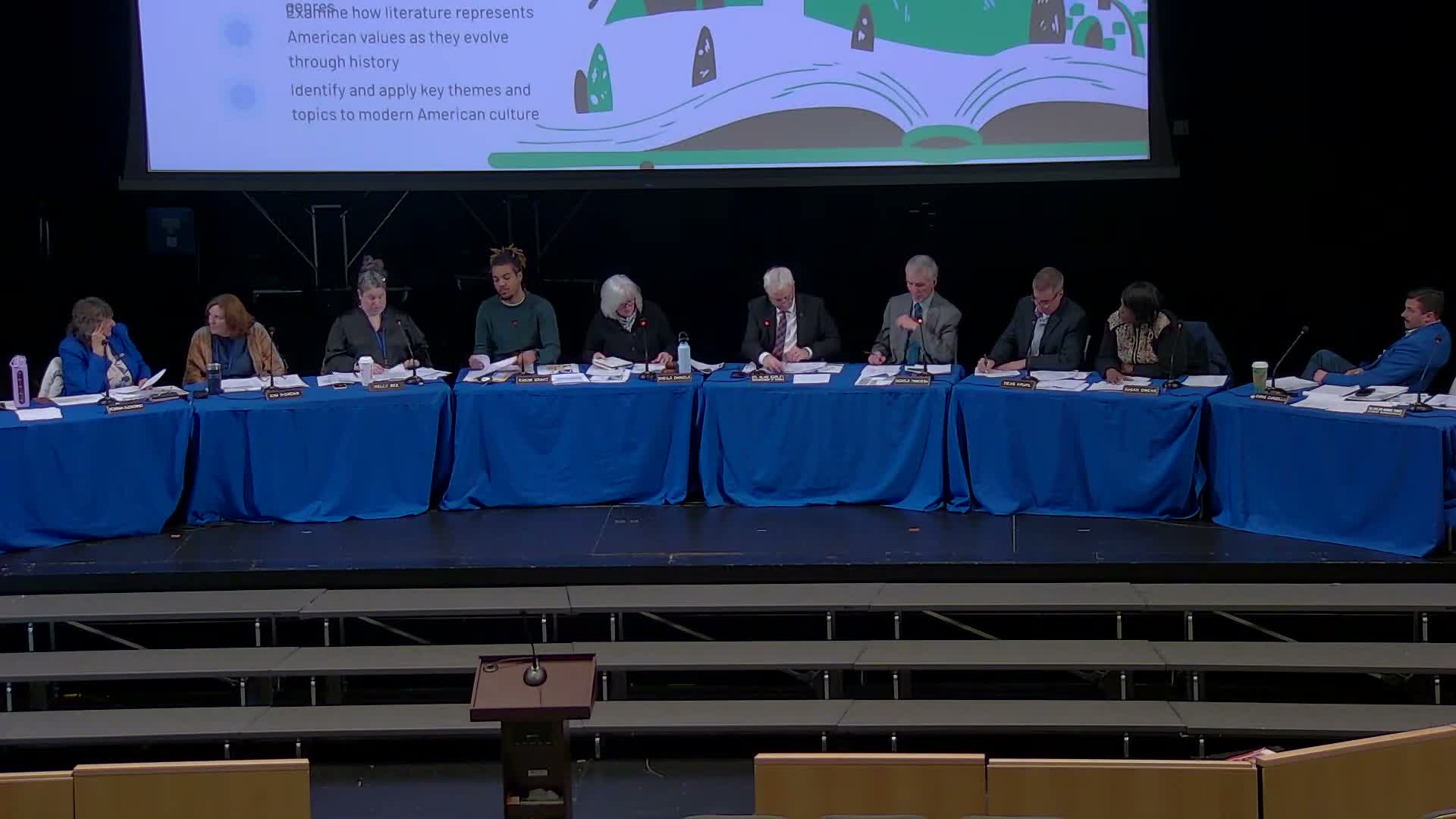 Curriculum staff presented the proposal as a response to updated Grade 10 offerings (including a relaunched co‑taught American Studies course) and identified overlap between current tenth‑ and eleventh‑grade texts. The presenters said the change would broaden the junior‑year novel study to include a wider, international selection while preserving Connecticut Core Standards and SAT preparation. They emphasized the update would not require additional district funding and that most needed texts are available in the department’s collection. “This is not a request for any additional funding,” a presenter said.