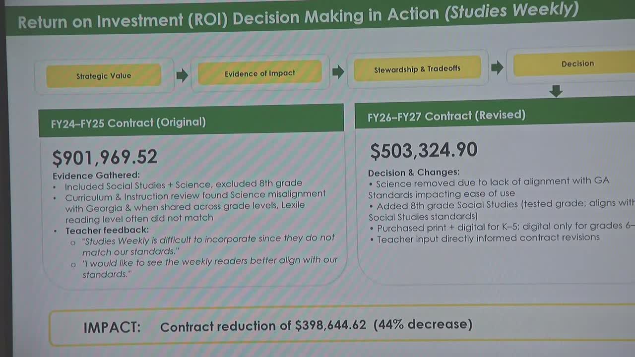As one example, staff said the Studies Weekly literacy contract showed misalignment with Georgia standards for science and inconsistent Lexile levels across grades; after teacher feedback and implementation review they proposed removing the science component and changing the purchasing model to reduce scope. Staff stated the contract will be reduced "from $900,000 to $500,000," a change described as generating roughly $400,000 in savings.