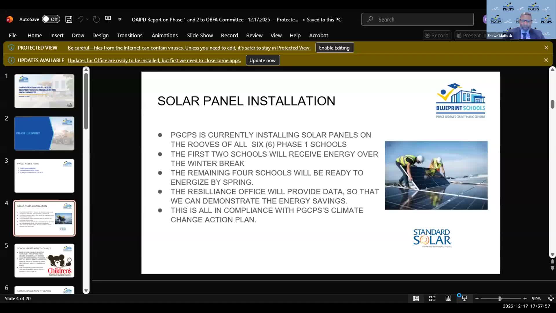 Solar installations: Matlock said solar-panel installation under the district's climate-change action plan is underway at all six phase 1 schools. "The first two schools will receive energy over the winter break. The remaining four schools will be ready for energizing by spring," he said, and added the resiliency office will provide data to demonstrate energy savings. He said the program may yield grant funding and potential tax credits.