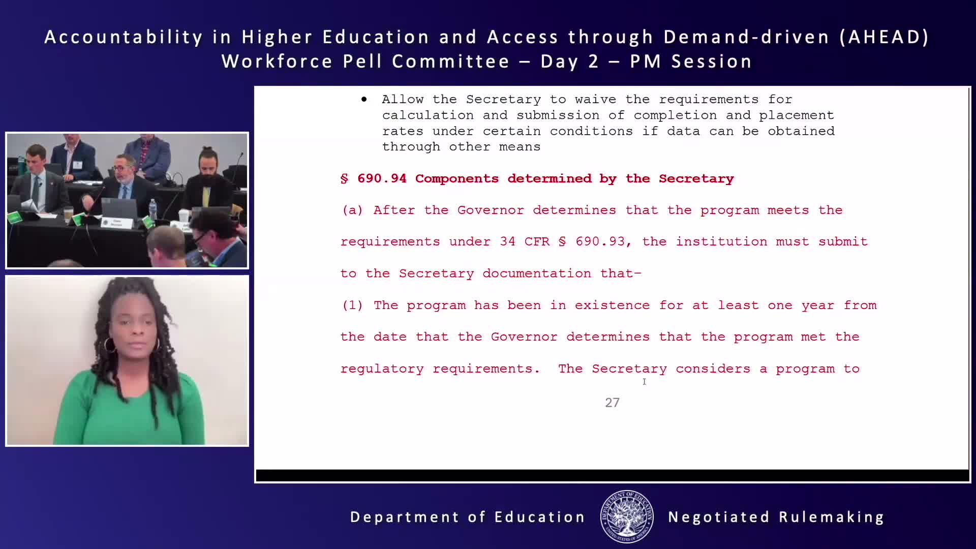During a U.S. Department of Education negotiated-rulemaking session, negotiators questioned how the Department will interpret the one-year existence requirement, define cohorts, and calculate 70% completion and placement thresholds; states flagged costs for wage‑record upgrades and asked for exemptions for students entering further education.