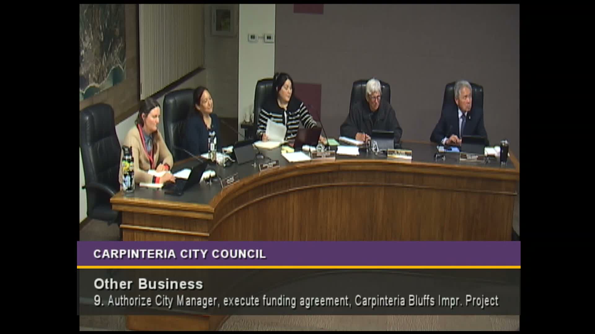 Carpinteria authorized a funding agreement with Santa Barbara County to accept up to $800,000 on a reimbursement basis for Carpinteria Bluffs improvements. Council and public commenters pushed staff to preserve the option to direct some funds toward land acquisition if parcels become available.