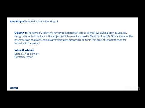 On process, the team set a next advisory meeting in March to convert advisory feedback into an itemized recommendation list for the building committee. Materials from the meeting and a recording will be posted on YouTube for public review.