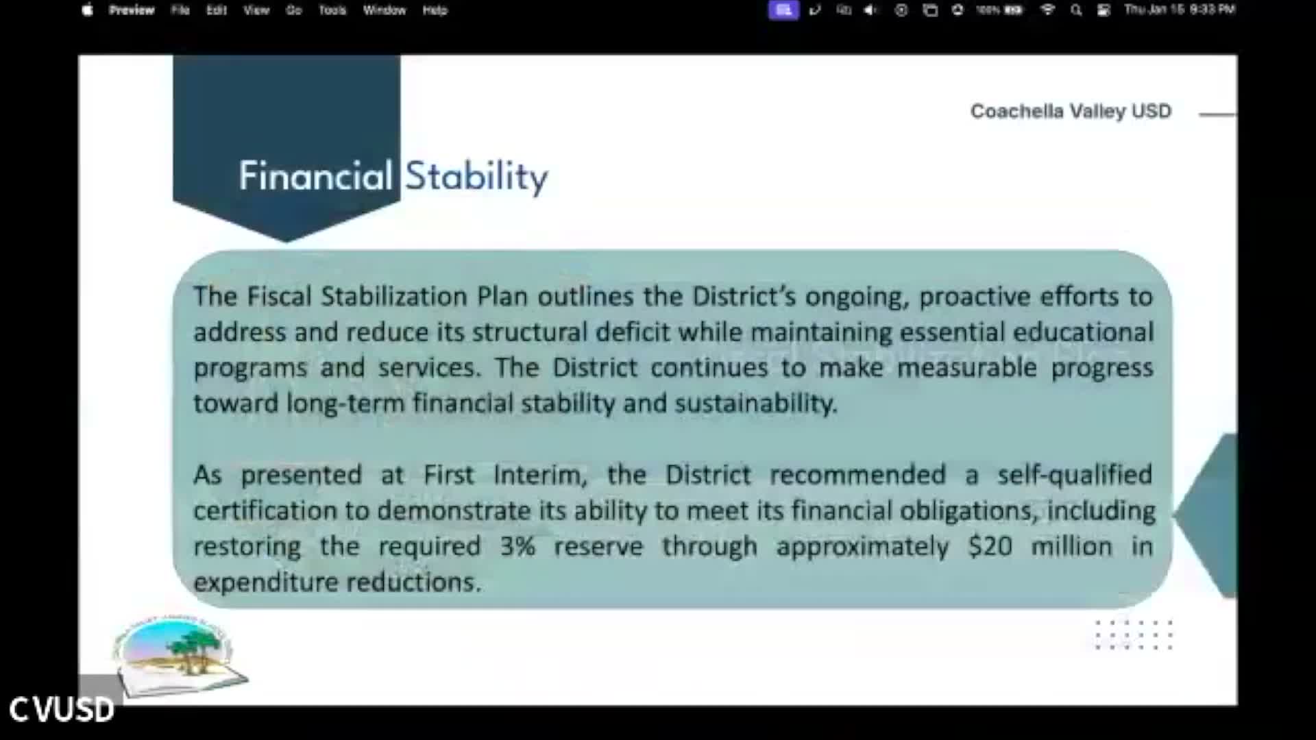 The Coachella Valley Unified School District presented an updated fiscal stabilization plan outlining three options to address a structural deficit, and trustees spent extended time debating which services to protect.