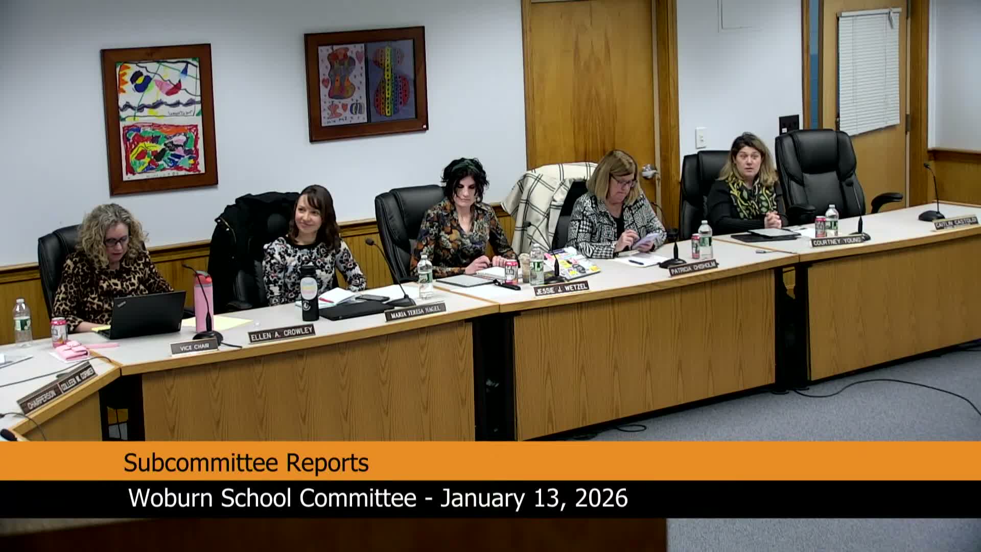 The committee authorized the chair to seek city council placement for an MSBA Statement of Interest to pursue a combined North Woburn school; resources subcommittee flagged buffer-zone policy work to address capacity with a goal for March completion and asked the committee to clarify a request to name a conference room after the late Joe Crowley (official vote deferred).