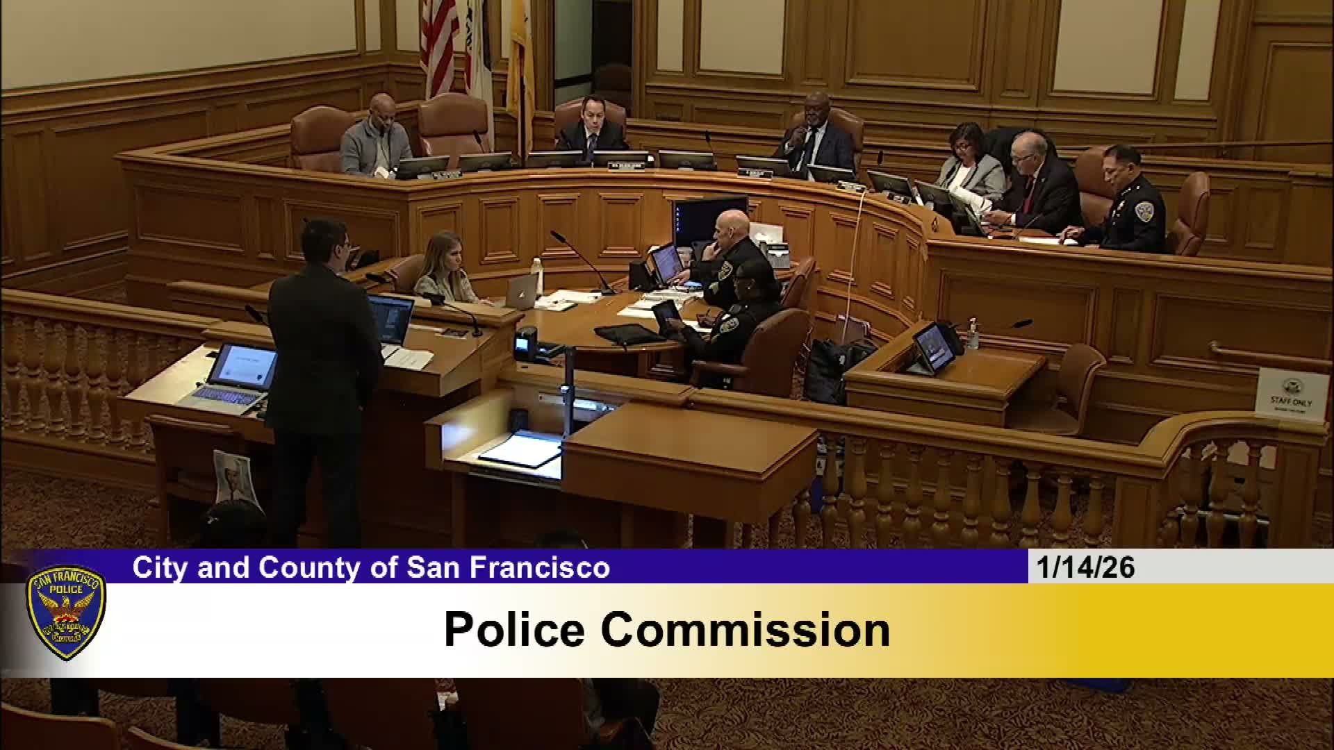 SFPD briefed the Police Commission on Jan. 14 that errors in stop-data collection have dropped to 'sub 5%' after checks and reminders, nine of 15 audit recommendations are marked complete, and procurement for a new system aims for a Q1 cutover; the Public Defender's Office praised the data as the first positive set since DGO 9.07.