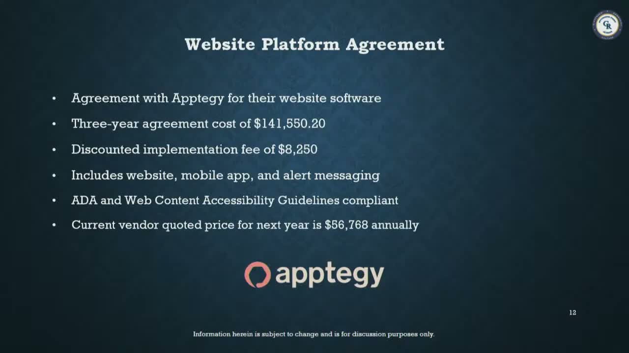 The board reviewed a three‑year website platform agreement with Apogee ($141,550 over three years) to improve ADA compliance and usability, and heard proposals for a no‑cost high‑school photography contract (Katie Photography), an Arbiter scheduling renewal ($5,938.50/year) and a postage‑meter lease ($385/month).