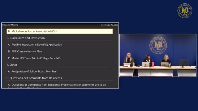 The district will submit a Flexible Instruction Day application under Section 1506 to the Pennsylvania Department of Education for multiple school years, presented a constituent-driven PDE chapter 4 comprehensive plan for public review, and approved a Model UN trip (April 17–19) with district-paid registration and transportation.