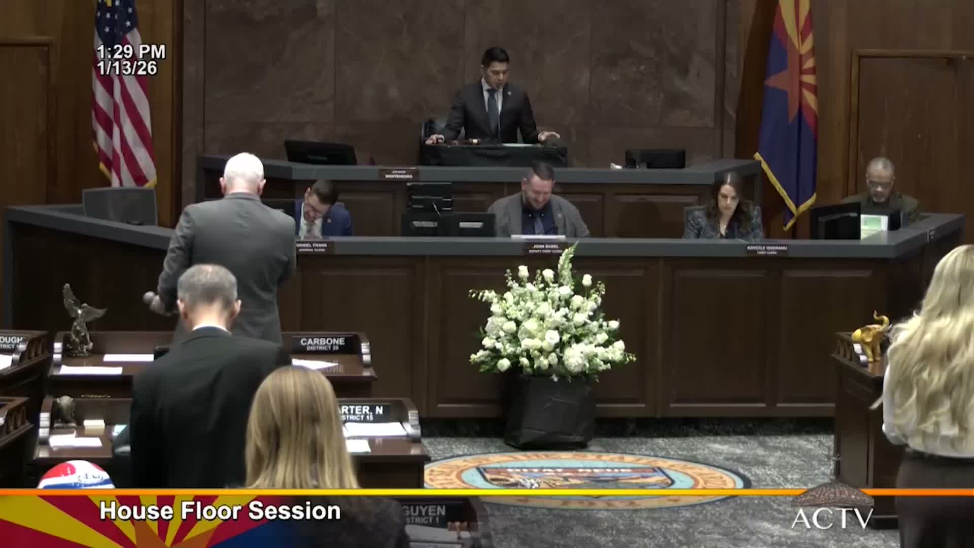 On Jan. 13, the Arizona House approved motions requesting the Senate's consent to adjourn and the clerk conducted first reading of dozens of bills spanning health, water, natural resources, appropriations, education and public safety; the House adjourned to 1:15 p.m. on Jan. 14.