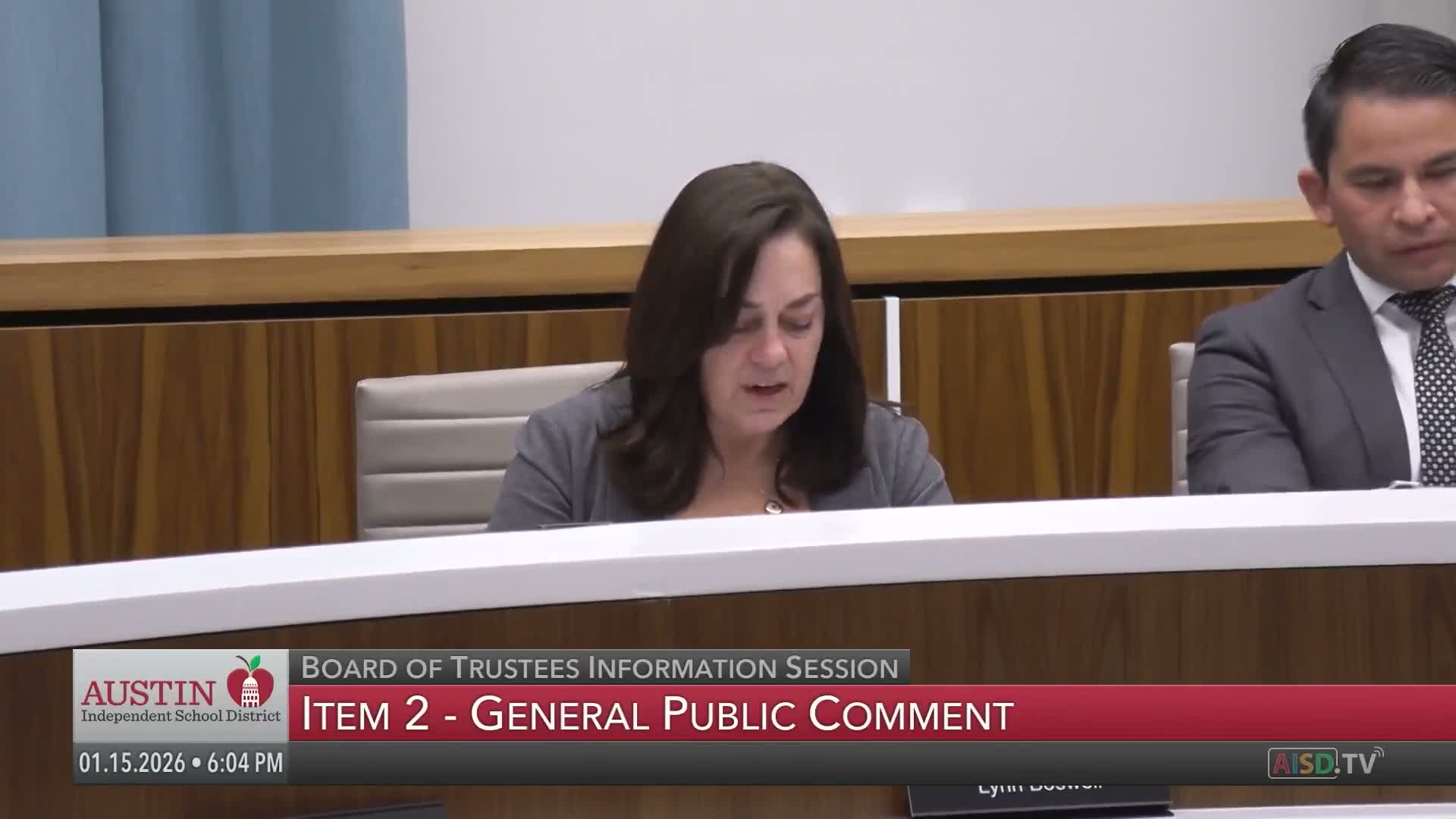 Brenda Malek, introduced by meeting staff as the first in‑person speaker, said community members negotiated a written agreement that designated the stadium a district facility with established scheduling and operations policies, but ‘‘AISD administration has chosen not to honor those obligations,’’ she said.