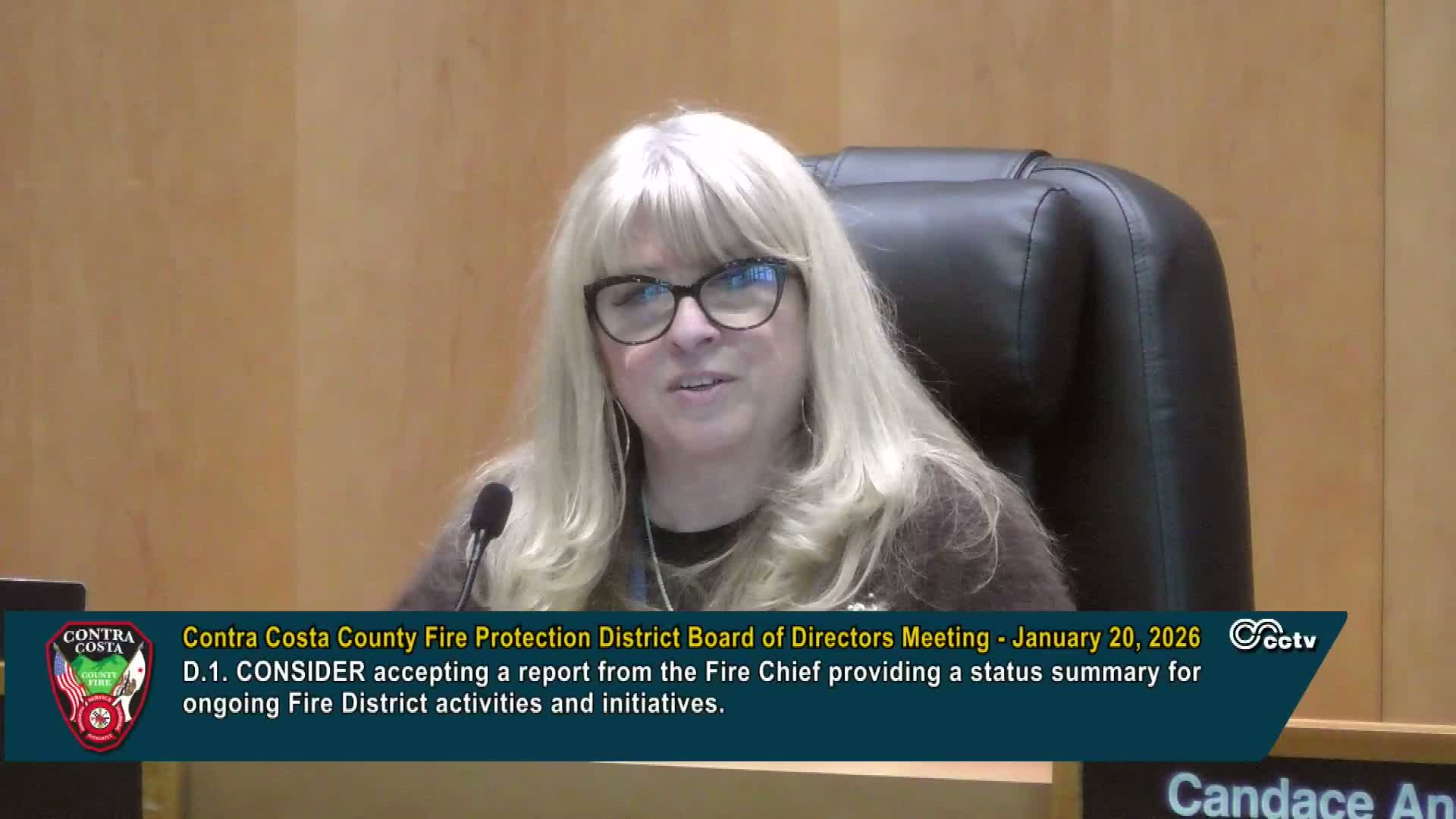 Fire Chief Burchard told the Contra Costa County Fire Protection District board the department plans to put a European-made Cold Cut Cobra on response vehicles to target EV battery fires and reported improved ambulance transport metrics, including 94.7% compliance and nearly 86,000 transports in 2025; the board approved the consent calendar unanimously.