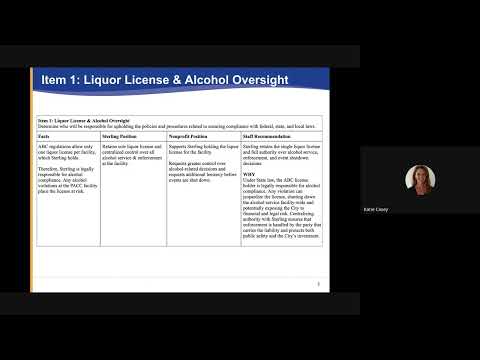 Because Sterling holds the facility's single Alcoholic Beverage Control (ABC) license, staff recommends Sterling retain sole control of liquor licensing, enforcement and event‑shutdown authority. "Under state law, the ABC license holder is legally responsible for alcohol compliance," Casey said, arguing centralized control protects the license and reduces city liability.