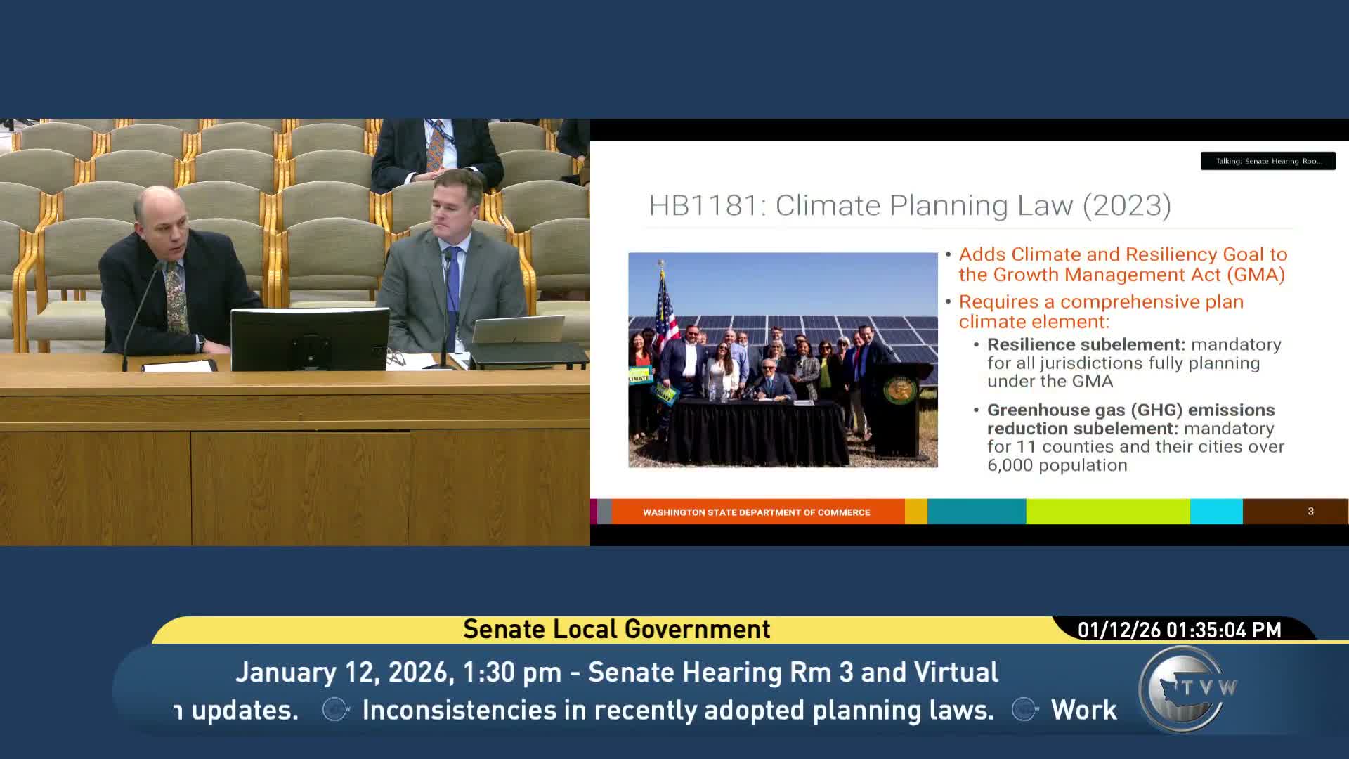 Department of Commerce staff told a Senate local government committee about the 2023 climate planning law’s resilience and greenhouse-gas subelements, recommended UW Climate Impacts Group mapping, introduced a Climate Policy Explorer of empirically supported measures, and described a $24M grant pot with about $5M remaining and a 2029 Puget Sound deadline.