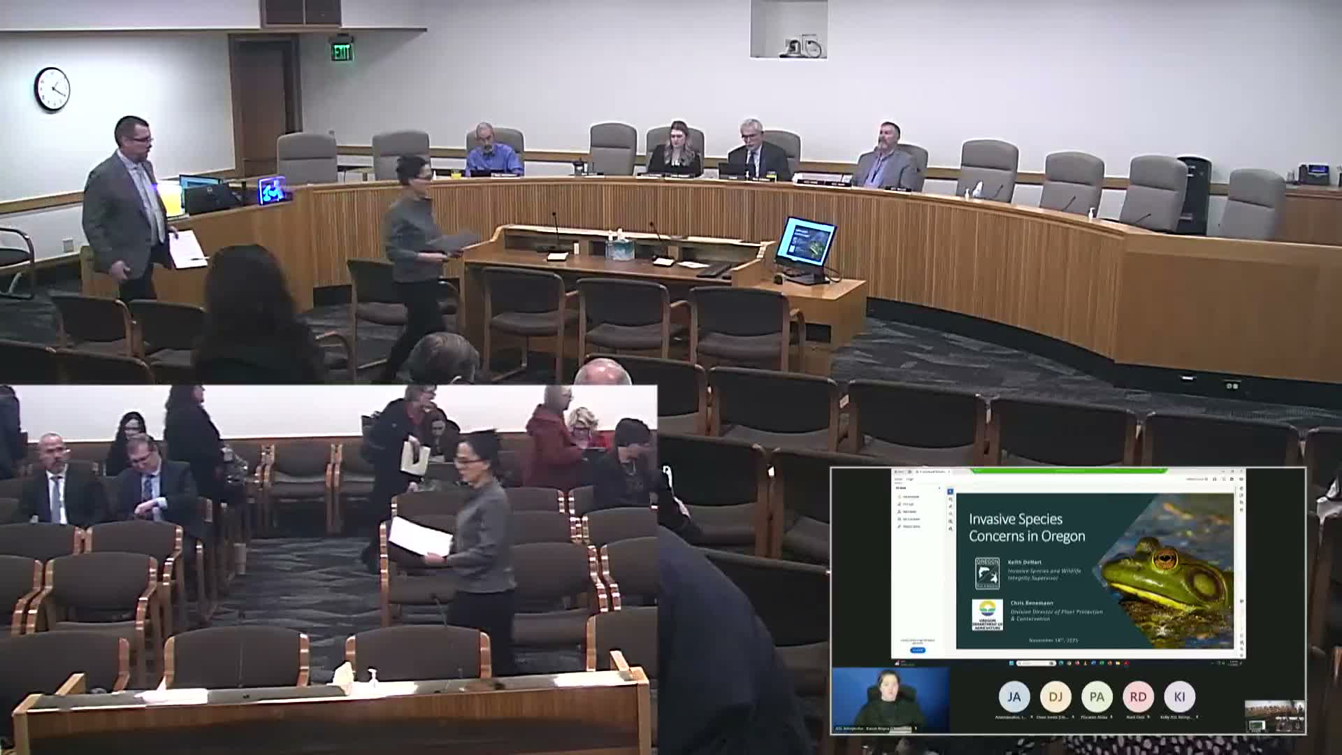 Committee members asked how port cargo inspections and federal actions interact with state prevention. Agencies explained that cargo and ballast water inspections are federally led; Oregon staff credited Portland CBP for a high interception rate and said intercepted vessels are decontaminated before re‑entry. Speakers cautioned that once species establish, eradication is rarely possible and long‑term control is costly; they asked the legislature to prioritize prevention funding, surveillance and inter‑state cooperation for border infestations.