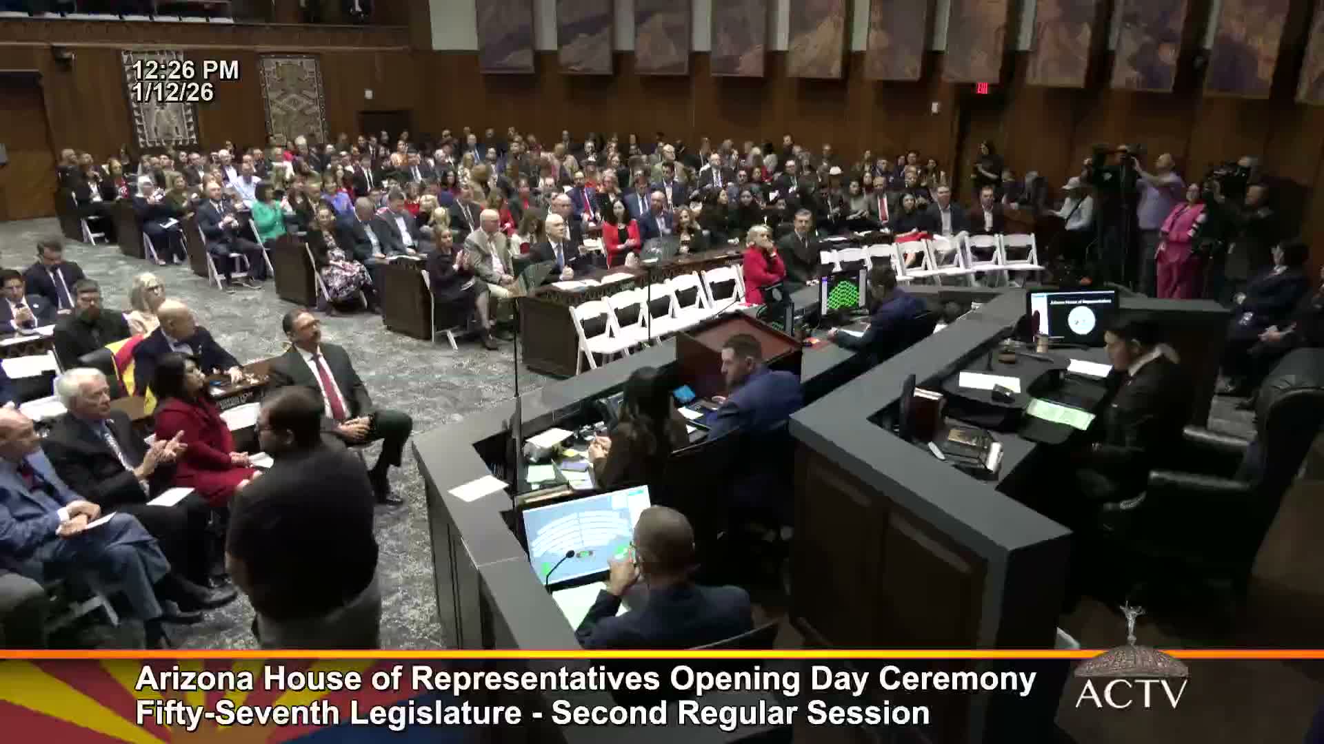 The Arizona House of Representatives convened for the second regular session of the 50th Legislature with ceremonial remarks, a prayer, and presentations from guests including doctors and university coaches.