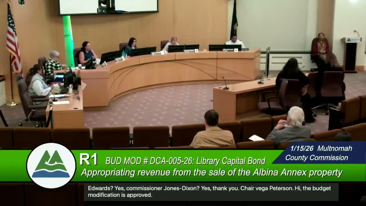 Multnomah County commissioners voted to approve a carry‑forward budget modification that moves unspent grant revenues into the current fiscal year to continue Reimagining Justice work in the Cully neighborhood.