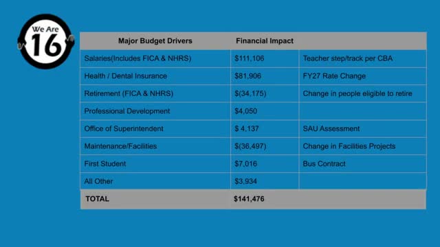 During the budget presentation, staff outlined key drivers: negotiated increases for union and nonunion employees (nonunion employees set at 3 percent), stepped increases for teachers per the CBA, health and dental rate increases quoted by HealthTrust, an added $4,000 in professional development, and bus‑contract adjustments with First Student. The presenters said the net budget change presented totaled $141,500, of which about $8,000 represents new increases while facilities costs fell by approximately $36,500.