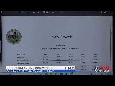 Speaker 5 (identified only by transcript label) presented the Town of Norwood’s preliminary fiscal 2027 budget to the Budget Balancing Committee on Jan. 14, saying the town currently projects a shortfall of about $6,600,000 and is incorporating a new $750,000 expense for regional dispatch.