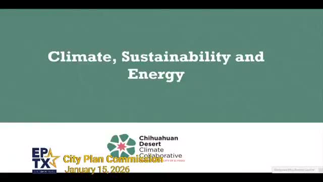 Climate and sustainability staff briefed the City Plan Commission on a two-year, community-driven draft climate action plan and several near-term pilot programs during the January meeting. Fernando Verano, presenting for Climate & Sustainability, said the plan covers El Paso and adjacent counties, was submitted to the Environmental Protection Agency in December and is expected to go to City Council for approval in March.