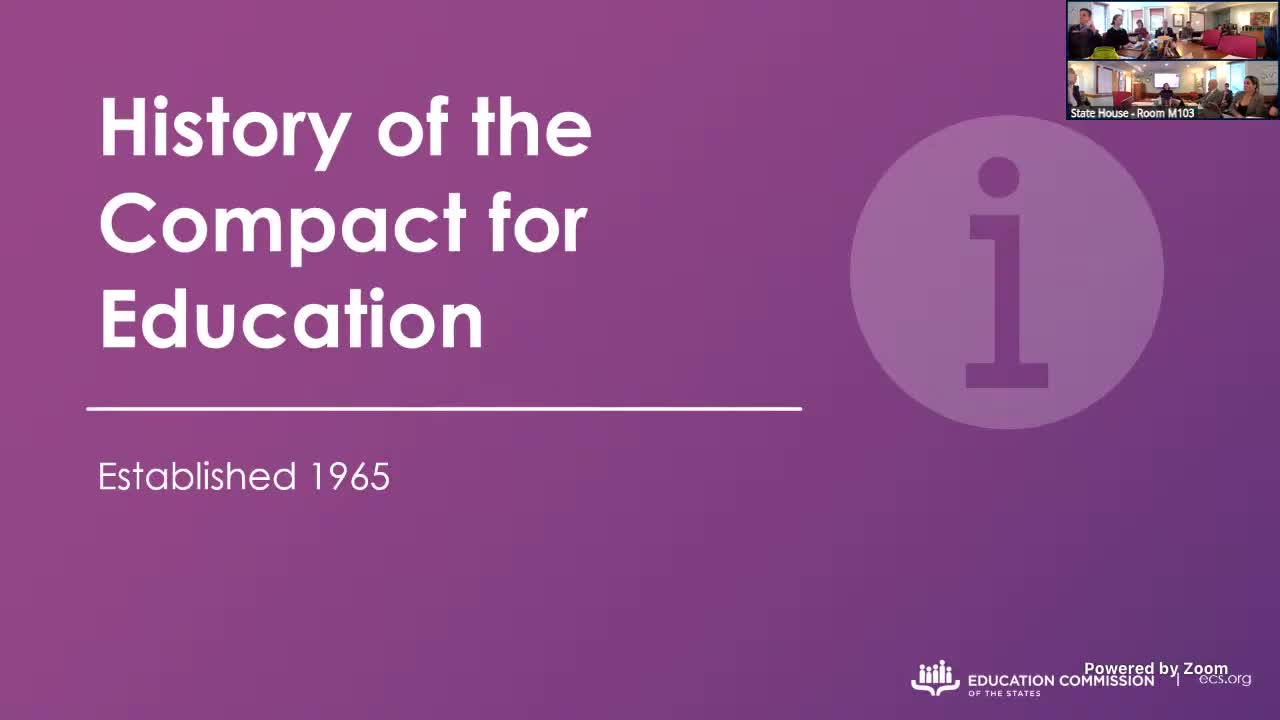 The House Education committee heard a presentation from Andy Gianni of the Education Commission of the States on the Compact for Education, confirmed Vermont withdrew in 1993, discussed dues totaling $53,100, and agreed to ask Legislative Council to insert rejoining language into a miscellaneous education bill.