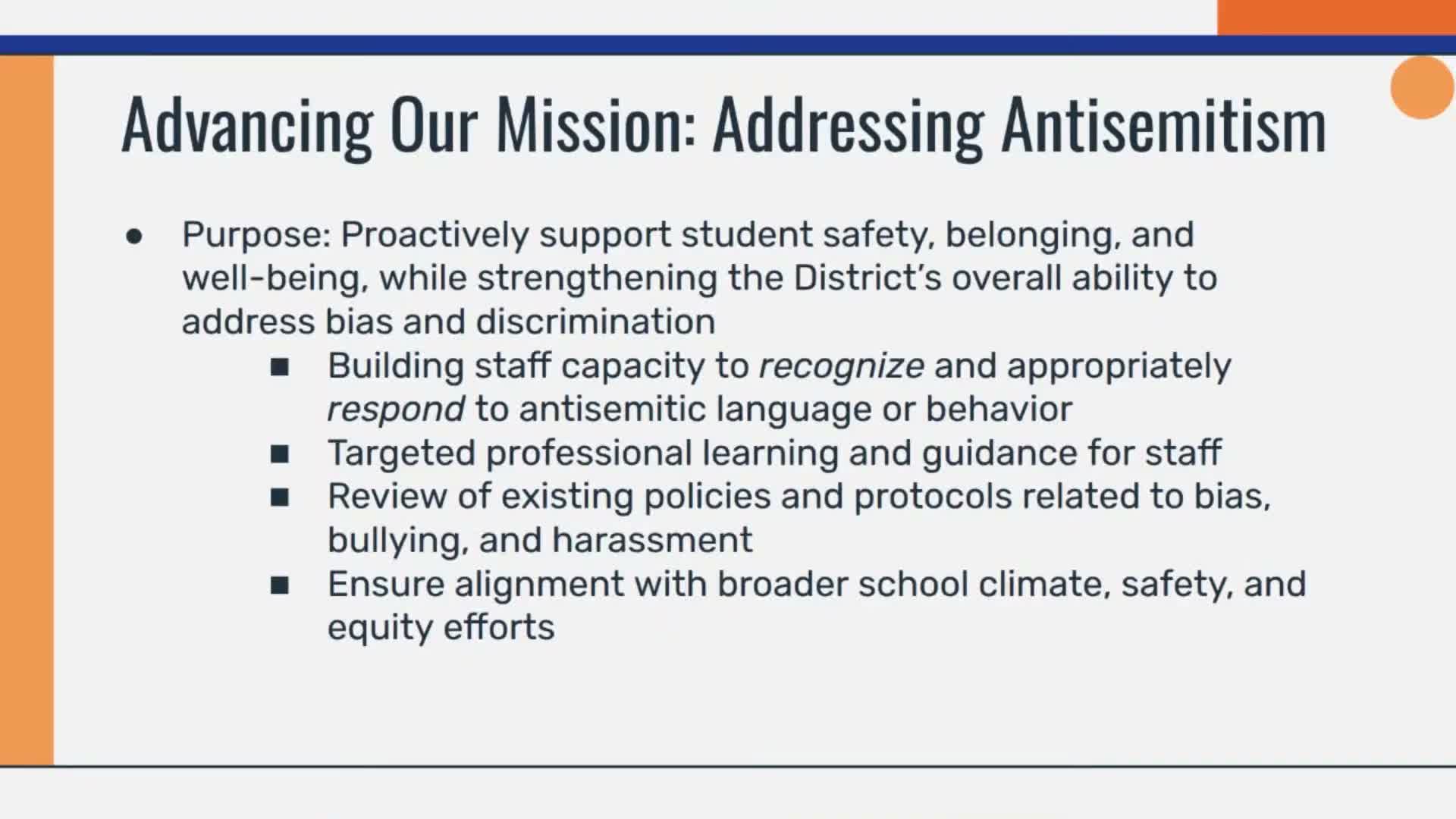 District administrators described a proactive strategy to train staff to recognize and interrupt antisemitic language and to align that training with existing bias, bullying and harassment policies; outreach to AJC, ADL and local partners is underway.