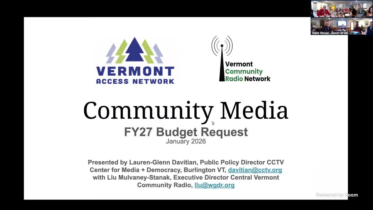 Vermont Access Network and a coalition of 33 community media organizations told the House Government Operations & Military Affairs Committee they need $1.89 million in FY27 (including $90,000 for community radio) to replace lost cable revenue, upgrade equipment and sustain local emergency broadcasting and archives.