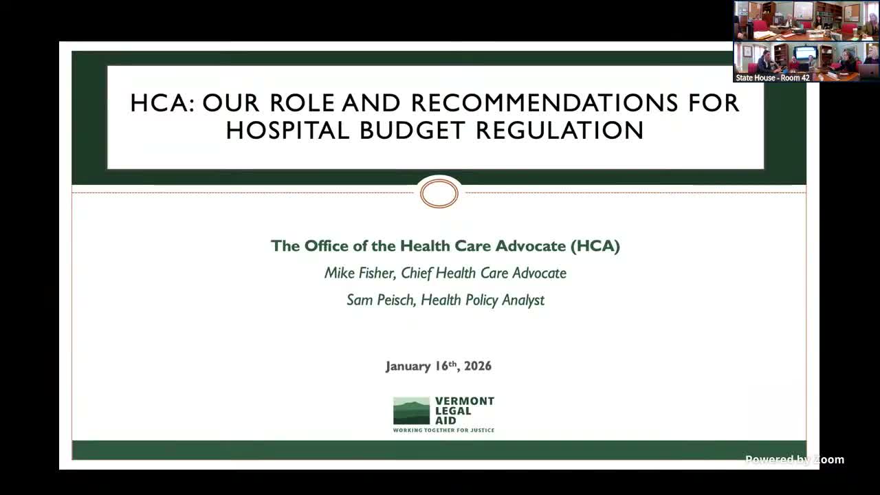 Mike Fisher of Vermont Legal Aid and an HCA representative told the committee that the office receives confidential filings and participates in Green Mountain Care Board budget reviews, and that its priorities include data integrity, expanding patient financial assistance, and shifting regulation away from a single net-patient-revenue focus.