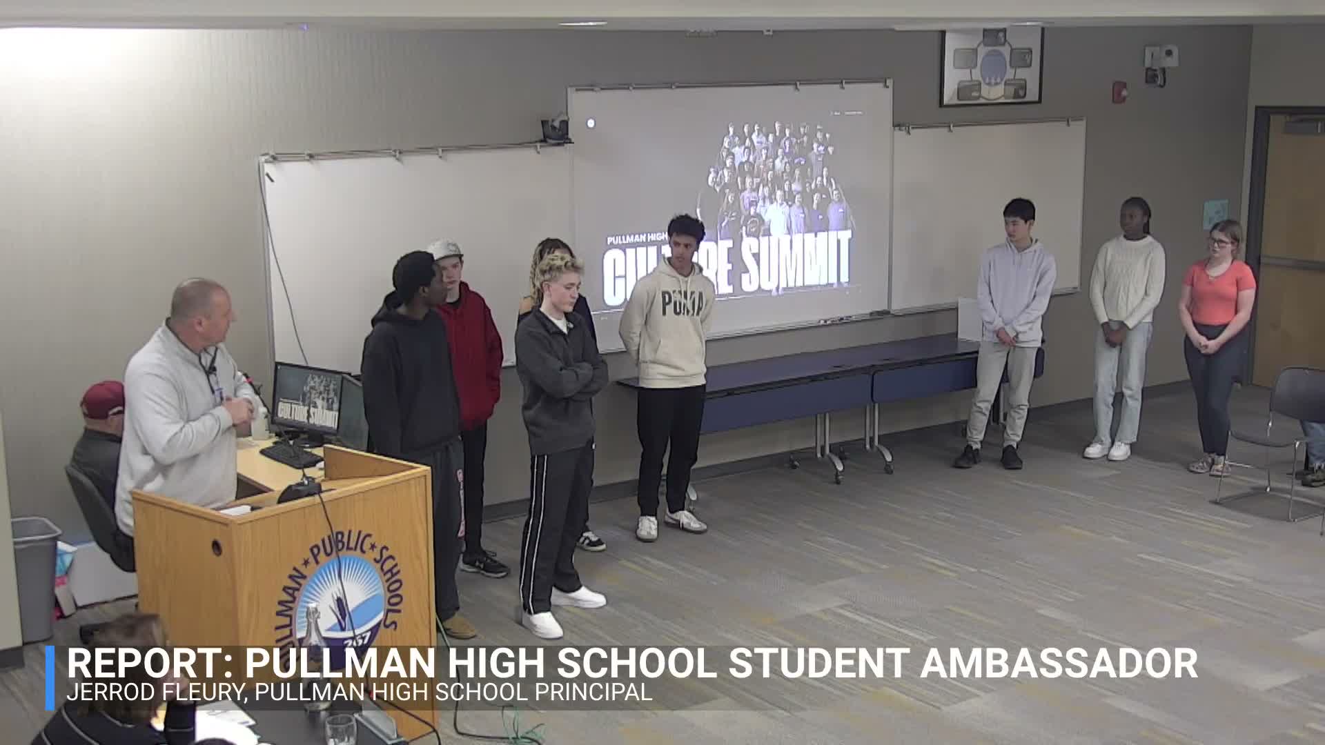 Pullman High student ambassadors presented a culture‑building initiative that includes a December culture summit for 50 students, plans for a student‑run podcast and social media outreach, and service projects focused on volunteering and a photo display to boost belonging.