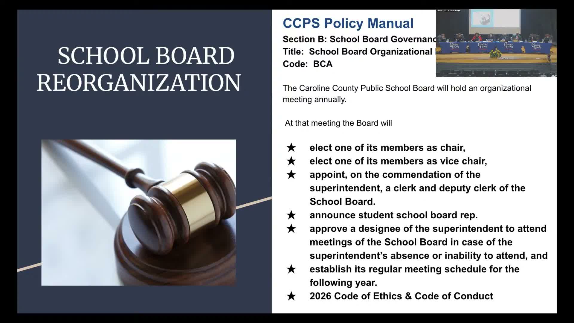 Superintendent Sarah Calverick opened the reorganization by citing Virginia Code sections 22.1‑72 and 22.1‑76, which require annual organizational actions and the establishment of a meeting schedule. Calverick reviewed the responsibilities of board leadership, including agenda preparation, committee assignments, and signing official documents.