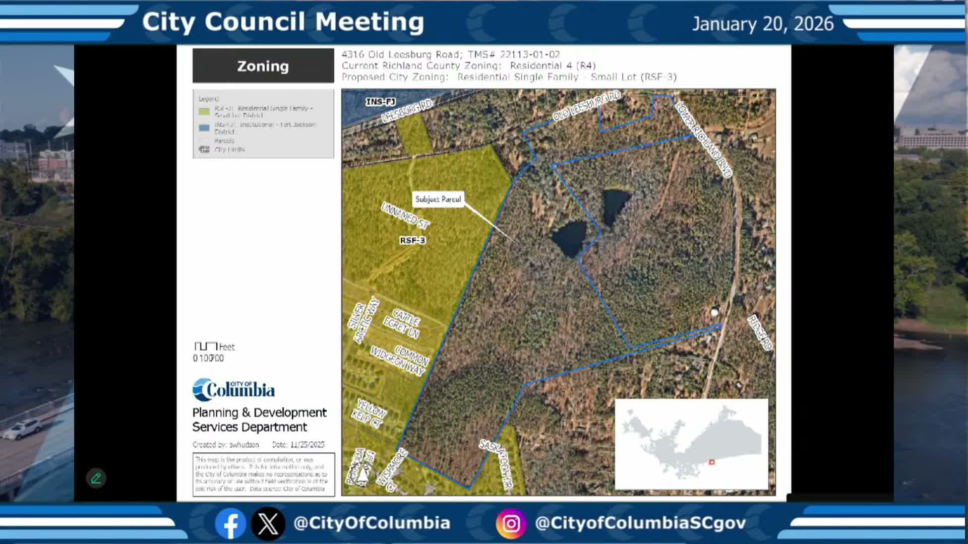 Columbia City Council on first reading approved annexation and a zoning map amendment for a 79-acre parcel on Southwestern Holloway Road proposed for expansion of the Canary Woods development, but the council asked the developer and landowners to secure a buffer and a cemetery-preservation plan before the second reading.