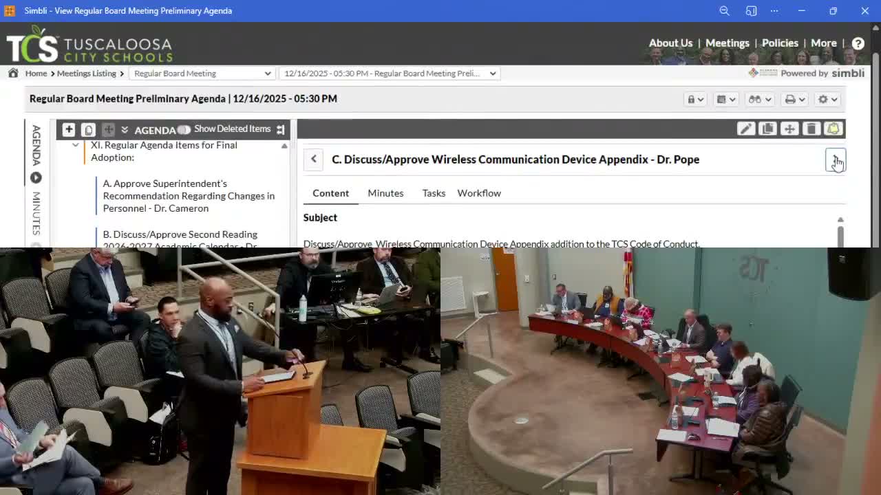 Tuscaloosa City Schools staff presented a proposed addition to the student code of conduct: a wireless communication device appendix intended to standardize consequences for first- through fourth-offense violations across secondary campuses.