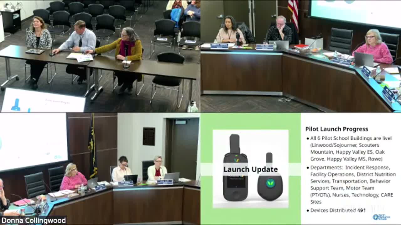 Staff outlined a phased rollout, saying full implementation that brings every staff member online is planned for the end of the 2026-27 school year (spring 2027), with ongoing surveys and site checks. No formal board action was taken that night on Vocera.
