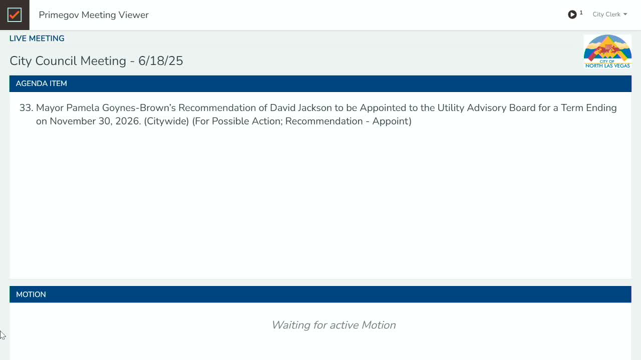 Mayor Pamela Goins Brown recommended and the council approved the appointment of David Jackson to the Utility Advisory Board for a term ending Nov. 30, 2026. Jackson introduced himself in the meeting as a long-time resident, military veteran and retired gaming-industry employee.