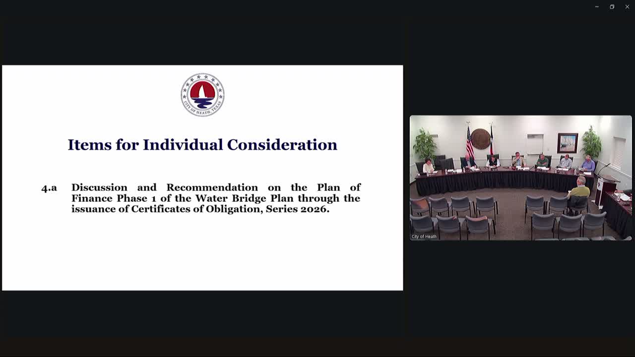 At a Finance Board meeting, Hilltop Securities advised a $40.5 million financing package for Heath’s water-bridge program, recommending a Texas 'double-barrel' pledge using utility revenues to avoid raising ad valorem taxes; the board signaled it was comfortable asking the city council to publish a notice of intent to issue up to $40 million, subject to further review of call features and phasing.