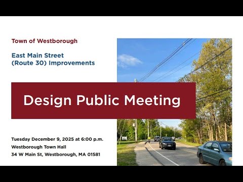 Town of Westborough DPW and consultants presented a MassDOT-funded plan for an 8-foot shared-use path along East Main Street (Hastings Elementary to Thomas Newton Drive), estimated at about $8.8 million and programmed for FY2030; residents raised questions about snow removal liability, mailbox relocations, retaining walls and a narrow Route 9 underpass.