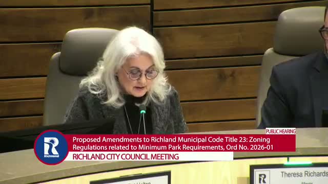 The Richland City Council unanimously approved the consent calendar (minutes, rezones, resolutions authorizing land agreements, leases and grants). Separately, ordinance 20‑26‑01 amending parking minimums passed 5‑1.