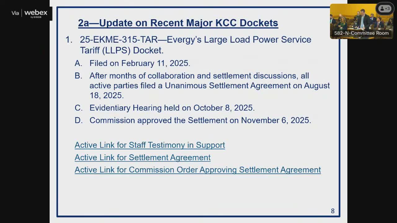 Justin Grady, director of the KCC Utilities Division, briefed the Committee about Kansas electric affordability, Evergy’s new large-load power service tariff (for customers >75 MW), the unanimous Evergy rate-case settlement of $128 million (~$8.47/month), and KCC approval of two combined-cycle plants and a 159 MW solar facility; he said protections (minimum contracts, heavy demand charges, collateral) are designed to protect existing captive customers.