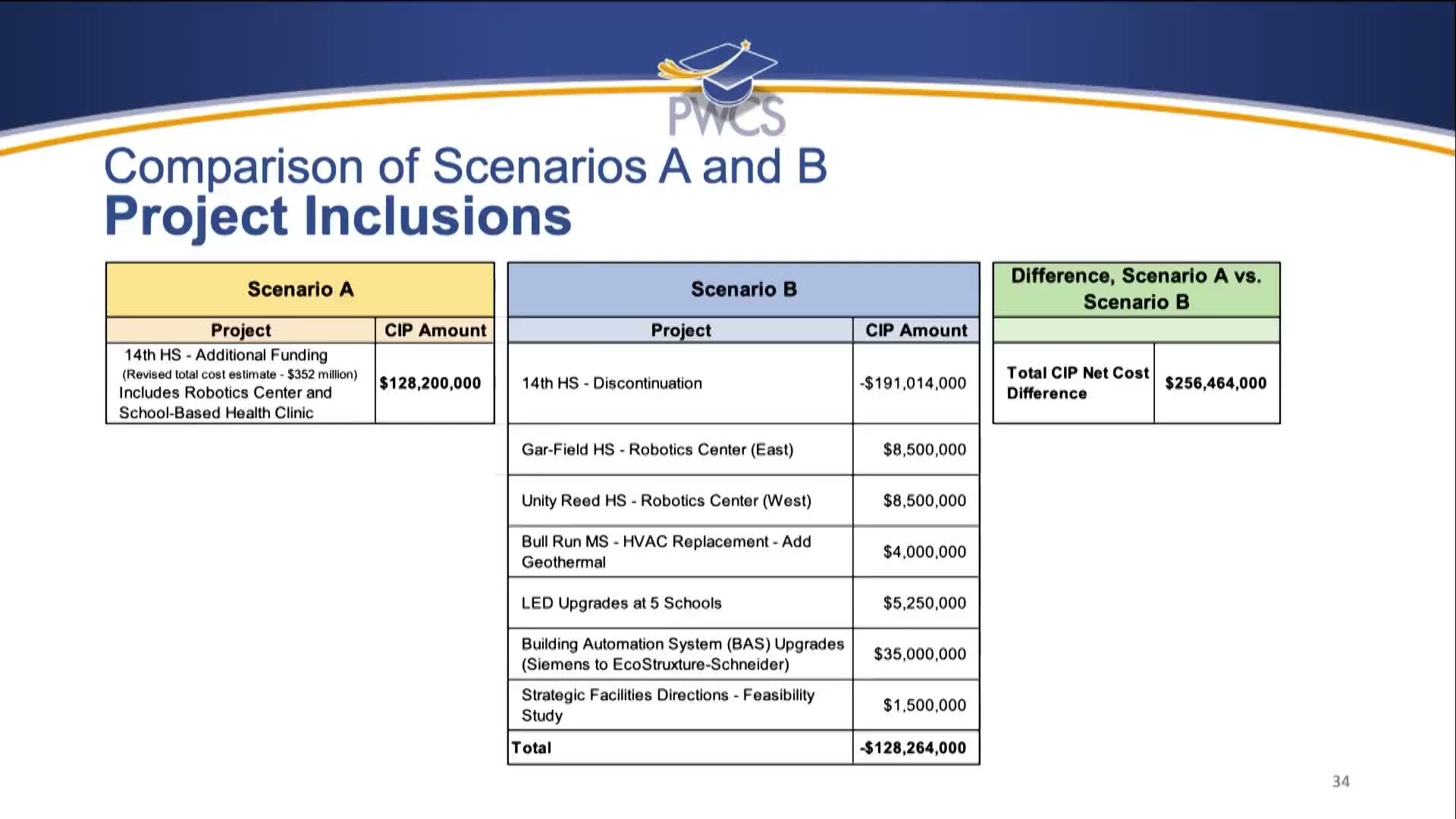 Chair opened a board discussion of the capital improvement plan and asked staff to summarize two options under consideration: Scenario A, which includes construction of a proposed 14th high school, and Scenario B, which would remove that school and fund other projects instead. "Scenario A contains the construction of the fourteenth high school," facilities staff said; the presentation highlighted an approximate $256,000,000 net increase in total CIP cost if the board selects Scenario A.