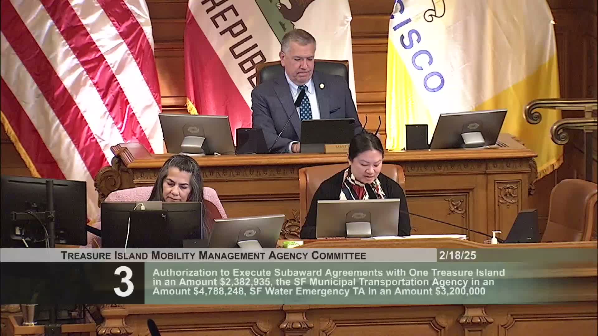 Cho said the subawards would allocate up to $2,382,935 to 1 Treasure Island, up to $4,788,248 to SFMTA and up to $3,200,000 to WETA to deliver the projects, and that next steps would include signing the subaward agreements, community engagement to refine project details, and procurement for service operators once federal clarity is secured.