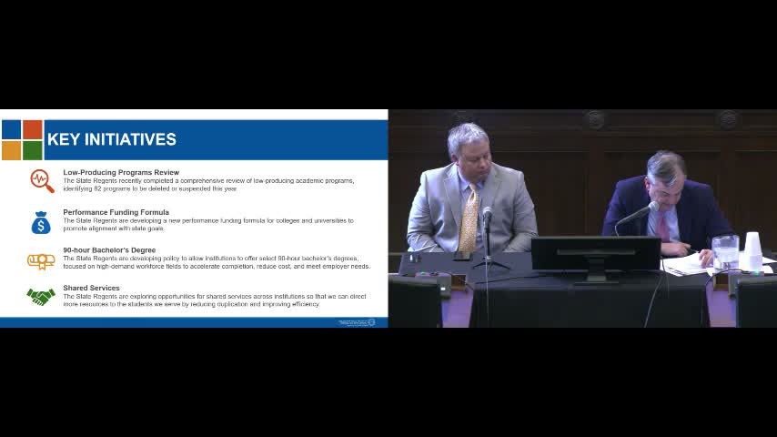 Regents leadership told lawmakers their comprehensive review of degree programs produced recommendations to delete 41 low‑producing programs and suspend 21 others, a total of 62 changes designed to better align academic offerings with workforce demand and institutional priorities.