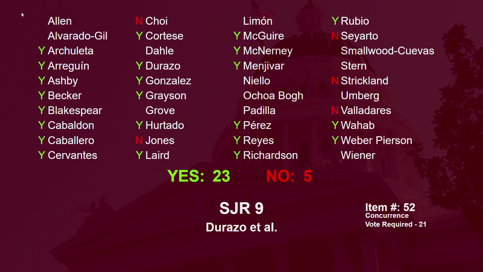The resolution passed by voice/roll call with the secretary reporting "Ayes, 39. Nos, 0." The presiding officer stated, "That resolution passes." After adoption, Senator Perez introduced Mayor Elizabeth Yang of Monterey Park as a guest on the floor.