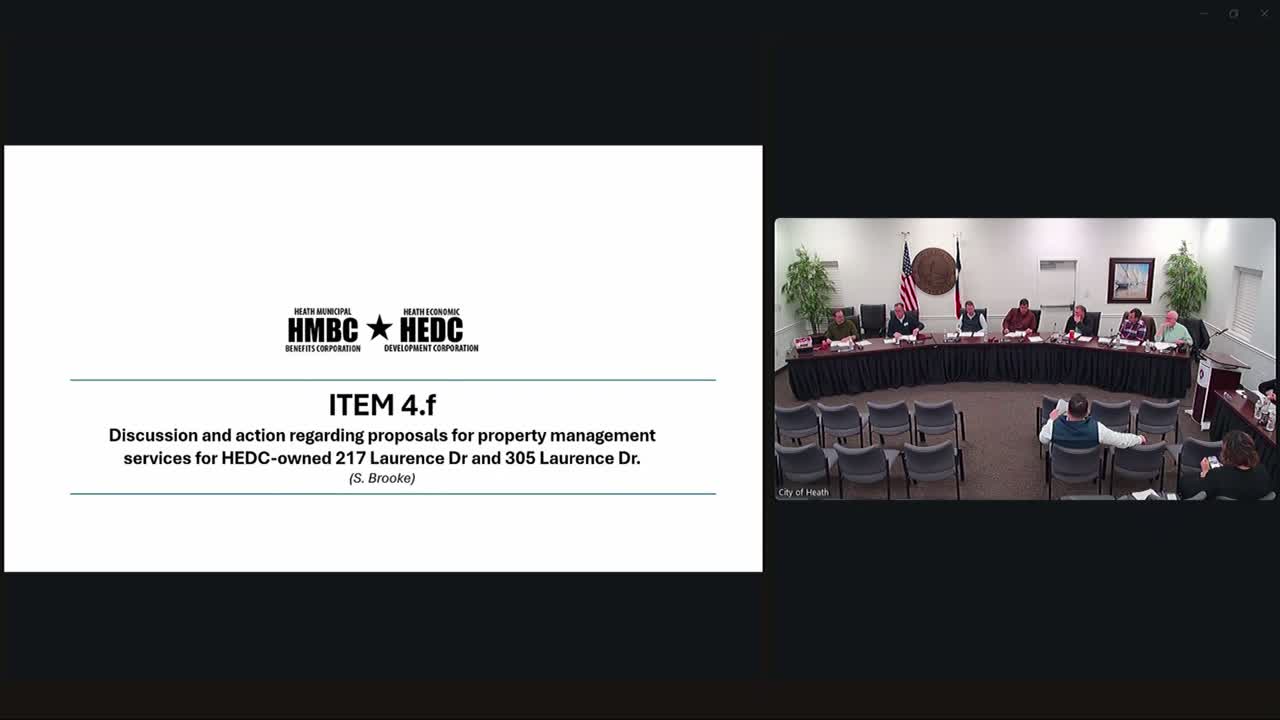 The Heath EDC/NBC board spent an extended portion of its Jan. 20 meeting reviewing proposals and options for two newly acquired properties, 217 and 305 Lawrence Drive. Staff and board members reviewed parcel sizes and tax implications as discussed with the county assessor, estimated remodel and demolition costs, and ongoing carrying costs. One presenter said remodel cost estimates for a named bidder exceeded $200,000 for a particular house. Board members repeatedly raised concerns about liability — especially the presence of an unused residential pool — and the administrative burden of operating as a residential landlord.