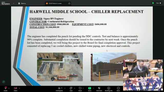 Joe Villareal, the district’s director for facilities, briefed trustees on HVAC projects the board authorized under ESSER and capital outlay funds. He said the Harwell Middle School chiller replacement is approximately 90% complete, with substantial completion expected next week, and that Memorial Middle School’s replacement is in schematic design with an estimated construction cost of about $450,000.