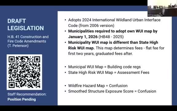 League legal director Jared Tingay told the Legislative Policy Committee that HB41 would adopt the 2024 WUI standard and require municipal WUI maps; HB215 would limit local vegetation ordinances but include a defensible-space carve-out. Cities raised concerns about fee exposure, appeals and structural hazards.